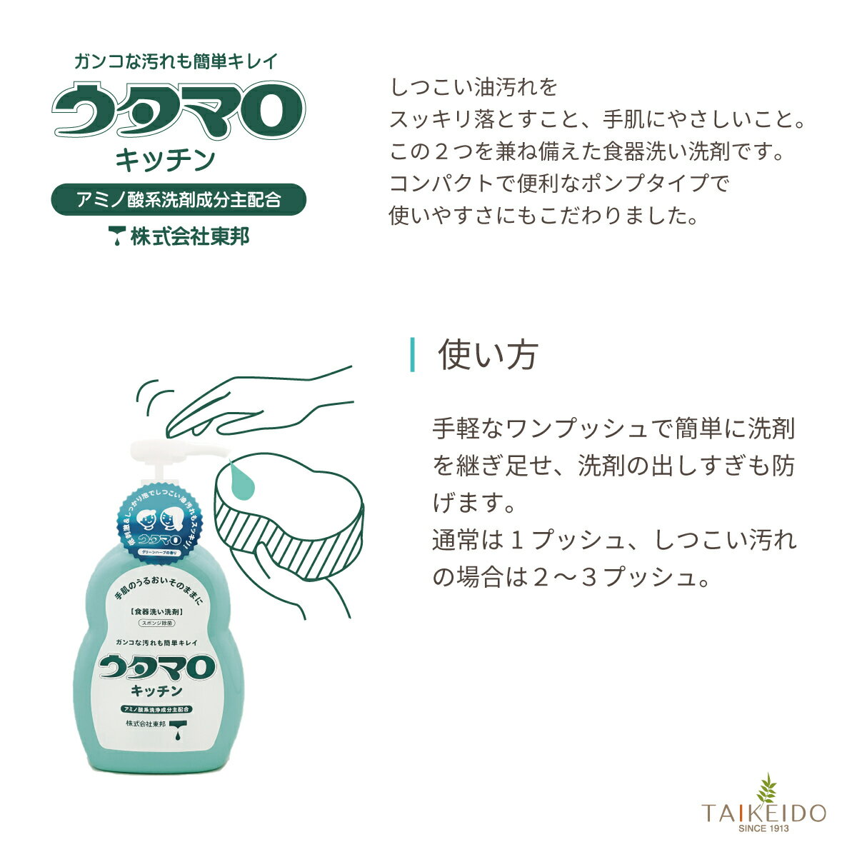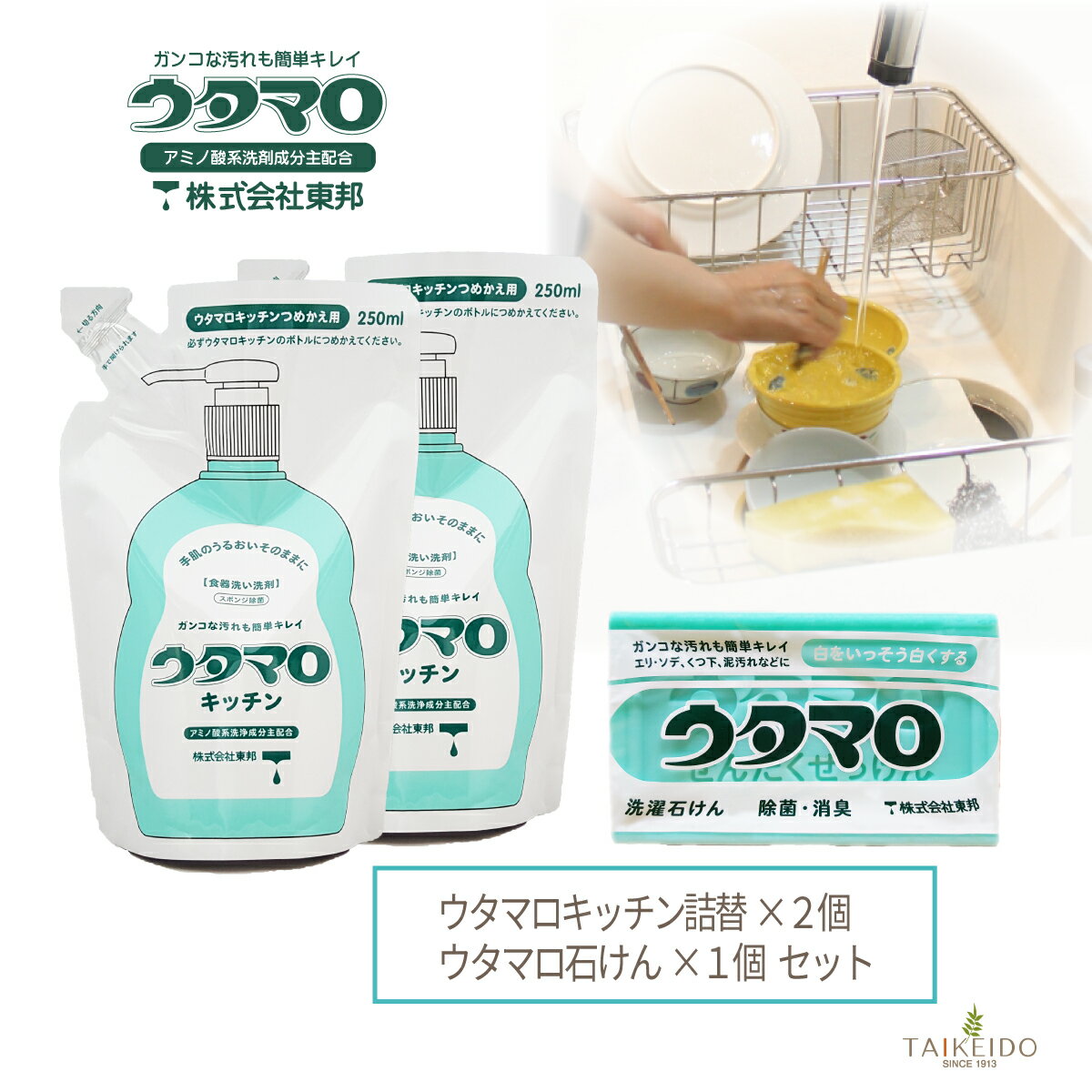 生産国/区分 日本製日用品・食器用洗剤製造販売元 株式会社東邦お問い合わせ 株式会社東邦大阪市生野区巽東2-19-19TEL:06-6754-3181ウタマロ石けん1個+ウタマロキッチン詰め替え用 350ml × 2個セット 掃除 「手肌へのやさしさ」と「ガンコな汚れに強い」 この2つの両立を目指した、素手でも使えて、 しつこい油汚れをスッキリ落とせる住居用洗剤です。