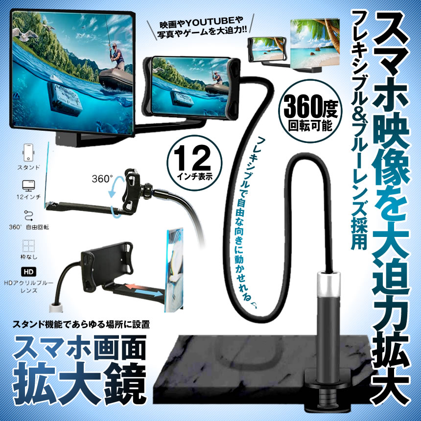 スマホ 画面 見やすい 拡大鏡 拡大ルーペ スクリーン クランプ アームスタンド 12インチ フレキシブル HD 360°回転 レンズ tecc-kakuarm