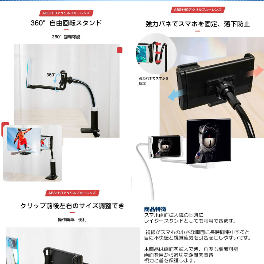 商品特徴 スマホ画面拡大鏡の同時に レイジースタンドとしても利用できます。