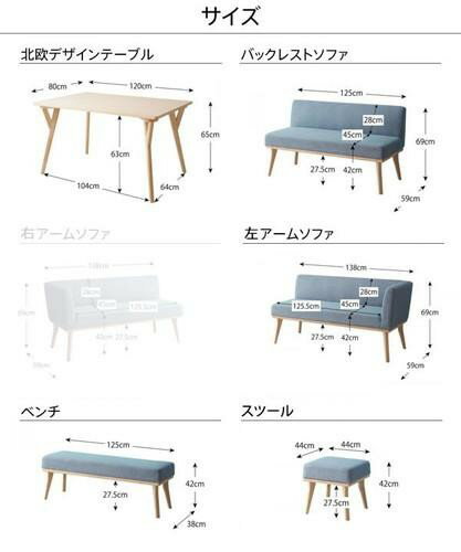 北欧デザイン リビングダイニングセット ■アームソファ (※左右共通サイズになります)【サイズ】横幅138 x 奥行59 x 高さ69 x 座面高42cm 【材質】ポリエステル【中材】木フレーム、ウェービングベルト 、Sバネ【製品重量】20kg 【カラー】ライトブルー / モカブラウン 【梱包サイズ/重量】横幅140 x 奥行63 x 高さ47 cm / 26kg 【生産国】中国 ※組立品■バックレストソファ【サイズ】横幅125 x 奥行59 x 高さ69 x 座面高42cm 【材質】ポリエステル【中材】木フレーム、ウェービングベルト 、Sバネ【製品重量】16kg 【カラー】ライトブルー / モカブラウン【梱包サイズ/重量】横幅127 x 奥行63 x 高さ47 cm / 19kg 【生産国】中国 ※組立品■ベンチ【サイズ】横幅125 x 奥行38 x 高さ42cm 【材質】ポリエステル【中材】木フレーム、ウェービングベルト 、Sバネ【製品重量】12kg 【カラー】ライトブルー / モカブラウン【梱包サイズ/重量】横幅127 x 奥行41 x 高さ23 cm / 13kg 【生産国】中国 ※組立品■オットマン【サイズ】横幅44 x 奥行44 x 高さ42cm 【材質】ポリエステル【中材】木フレーム、ウェービングベルト 、Sバネ【製品重量】6kg 【カラー】ライトブルー / モカブラウン【梱包サイズ/重量】横幅47 x 奥行48 x 高さ23 cm / 7kg 【生産国】中国 ※組立品■北欧デザインテーブル(W120/W140)【サイズ】 幅120/140 奥行80 高さ65cm【材質】 天板:天然木化粧板(アッシュ) 仕上げ:ウレタン塗装 脚部:天然木(ラバーウッド)【製品重量】23kg/25kg【梱包数】2【梱包サイズ】 W120:129 89 8cm W140:144 88 9cm 脚部:70 57 16cm 【生産国】ベトナム ※組立品■3点セット セット内容:ダイニングテーブル、アームソファ、バックレストソファ 梱包数:4■4点チェアセット セット内容:ダイニングテーブル、アームソファ、バックレストソファ、オットマン 梱包数:5■4点ベンチセット セット内容:ダイニングテーブル、アームソファ、バックレストソファ、ベンチ 梱包数:5■5点セット セット内容:ダイニングテーブル、アームソファ、バックレストソファ、オットマン、ベンチ 梱包数:6※1年保証付き。