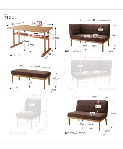 北欧デザイン リビングダイニングセット ■アームソファ (※左右共通サイズになります)【サイズ】(約)横幅138 x 奥行68 x 高さ80 x 座面高40cm 【材質】ポリエステル【中材】木フレーム、ウェービングベルト 、Sバネ【製品重量】(約)25kg 【カラー】ブラウン / ベージュ 【梱包サイズ/重量】(約)横幅140 x 奥行72 x 高さ60 cm / 29kg 【生産国】中国 ※組立品■バックレストソファ【サイズ】(約)横幅120 x 奥行68 x 高さ80 x 座面高40cm 【材質】ポリエステル【中材】木フレーム、ウェービングベルト 、Sバネ【製品重量】(約)21kg 【カラー】ブラウン / ベージュ【梱包サイズ/重量】(約)横幅123 x 奥行72 x 高さ60 cm / 24kg 【生産国】中国 ※組立品■ダイニング棚付きテーブル【サイズ】 W150:横幅150 奥行80 高さ64cm【材質】 天板:天然木化粧板(オーク) 仕上げ:ウレタン塗装 脚部:天然木(ラバーウッド)【梱包数】1【梱包サイズ】 W150:横幅160 奥行90 高さ12cm【生産国】ベトナム ※組立品■ベンチ【サイズ】(約)横幅120 x 奥行46 x 高さ40 x 座面高40cm 【材質】ポリエステル【中材】木フレーム、ウェービングベルト 、Sバネ【製品重量】(約)12kg 【カラー】ブラウン / ベージュ【梱包サイズ/重量】(約)横幅123 x 奥行48 x 高さ20 cm / 15kg 【生産国】中国 ※組立品■4点ベンチセット セット内容:ダイニングテーブル、アームソファ、バックレストソファ、ベンチ 梱包数:5※1年保証付き。